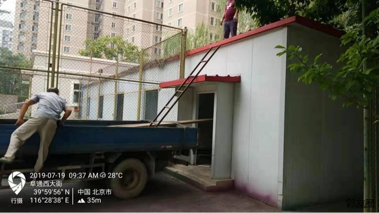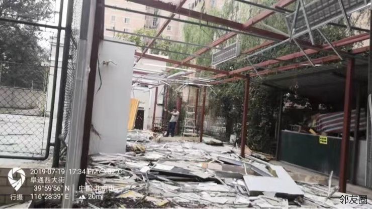此次拆除的违建位于学校操场边,共计两处,一处被用作学校的器材室,另一处被用作垃圾存放处,全部为简易彩钢房屋,面积约117平米。管片队员介绍说,这两处违建已经建成使用很多年了,因为位于学校内部,不临街、没举报、又是一层不超高,很难被发现。综合行政执法队借助街道创建“无违建社区”的契机,加大了巡检力度,对辖区社会单位进行拉网式排查,该处违建无处藏身,才得以被发现。经约谈,校方爽快答应配合拆违工作,并提出帮拆申请。望京执法队考虑到拆除过程中将会产生噪音,难免对学生学习造成影响,于是决定清理腾退后暂缓拆除,待学生放暑假后再实施拆除作业。