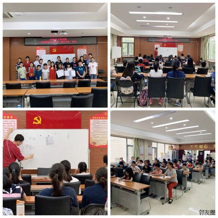 爽秋路社区举办“新时代文明实践——青少年暑期硬笔书法”活动,邀请专业书法老师专场授课,现场指导。孩子们在完成各自的书法作品后,请老师进行点评并与老师合影。