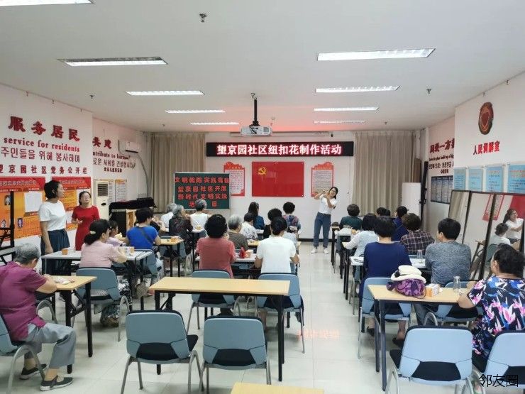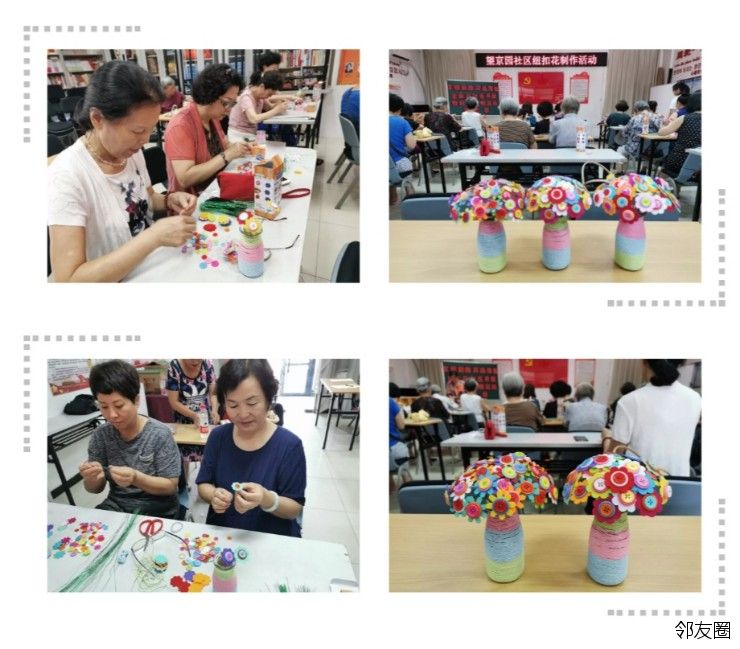 望京园社区新时代文明实践站为丰富居民生活情趣,组织开展了纽扣瓶花制作活动。