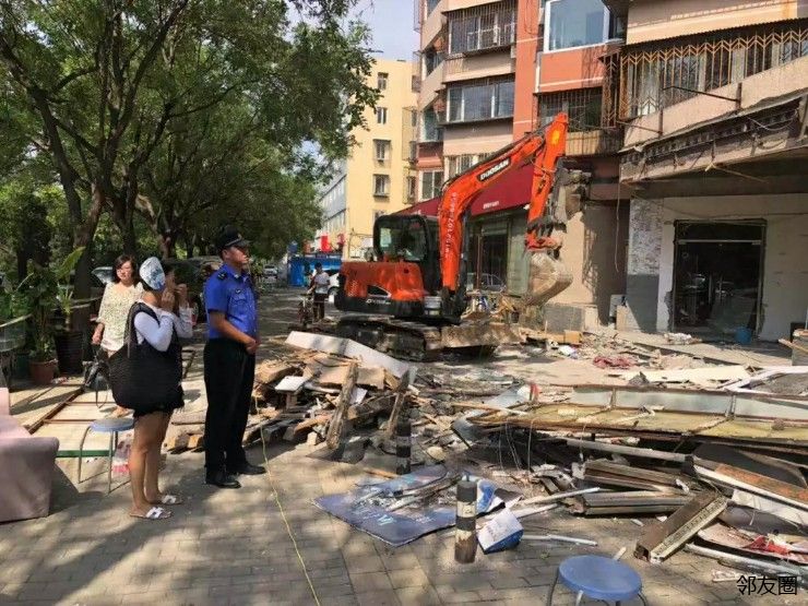 在花家地南里拆违中,城管执法队本着条件成熟一处拆除一处的原则,由易到难逐步推进,通过加大宣传、督促力度,“以拆促拆”,形成浓厚整治氛围。近期,陆续拆除了2号楼绿源电动车、烟酒商贸、中国体育彩票、湘足保健,5号楼尚古足道等临街商户的违建,今天,4号楼京芝堂药店、烟酒茶超市、金星银星洗衣违建也开始拆除了。