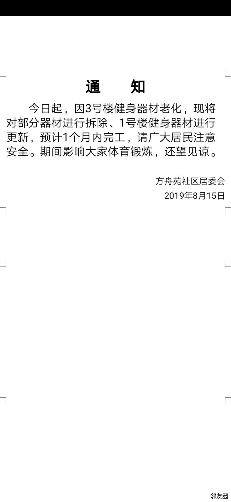 方舟苑社区居委会针对部分老化健身设施进行拆除更新通知