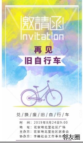 上次的僵尸自行车换购生活用品的活动得到了广大居民的好评,所以本周六花家地北里社区准备再次开启这个活动,希望北里的居民朋友们和我们一起把这件美化社区环境的好事宣传起来,让更多的居民参与其中,共同打造和谐宜居的美好生活