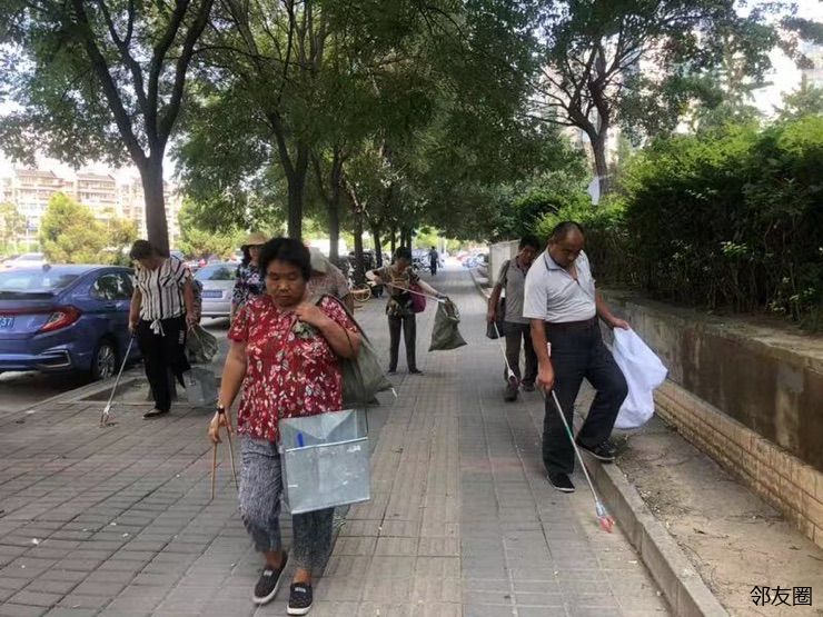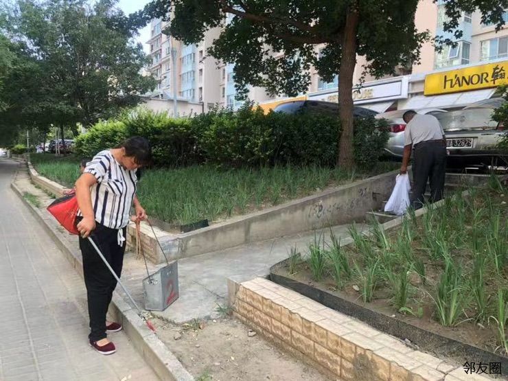 南湖西园二区社区居干带领清洁队人员清理小区周边环境卫生,平房区堆物堆料,码放共享单车、督促社会单位门前三包。