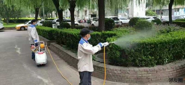 2019年8月26日上午马氏消杀公司在社区内安装蝇笼、放鼠药、向花草树木喷撒杀虫药。