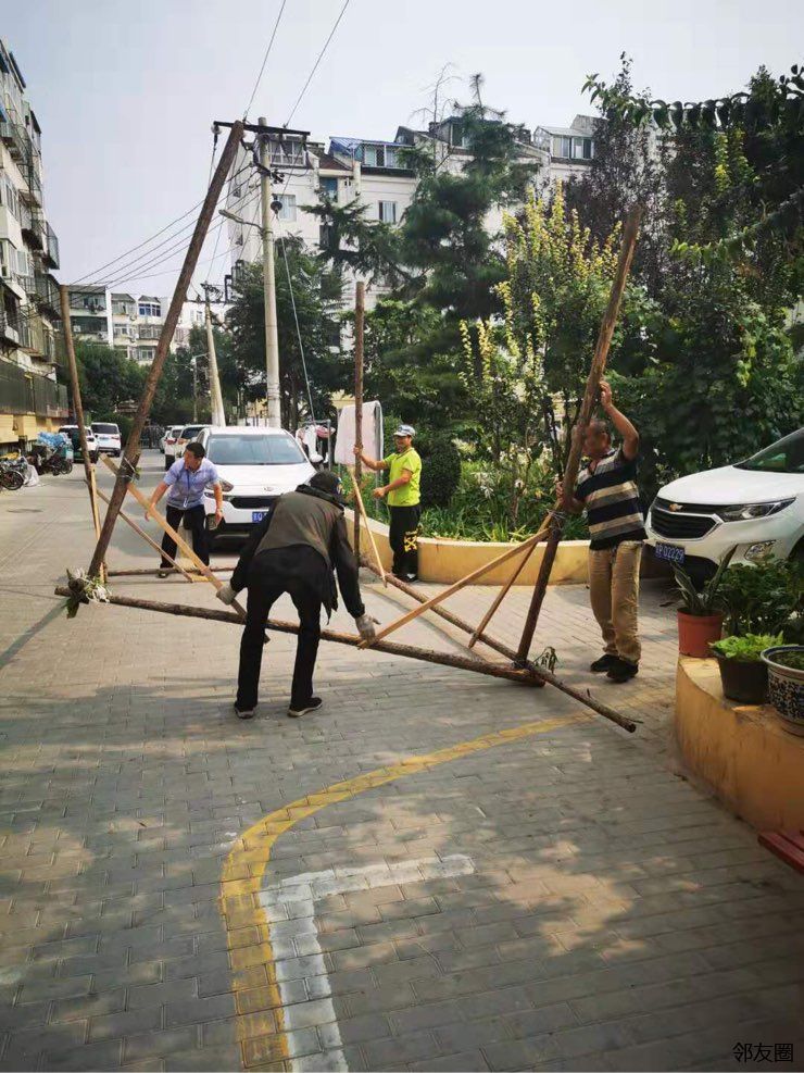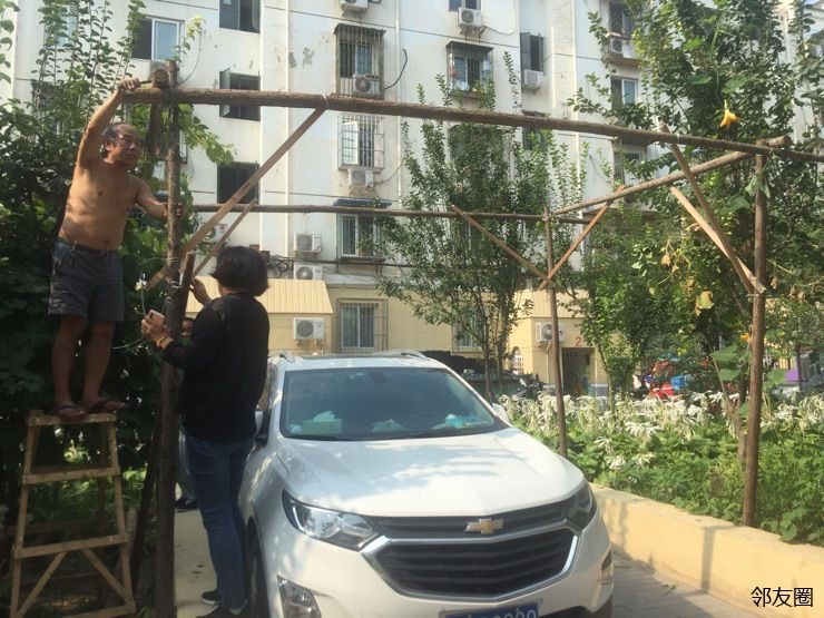 今天上午在花家地北里17号楼前的花园里,一位居民竟然搭起了架