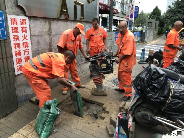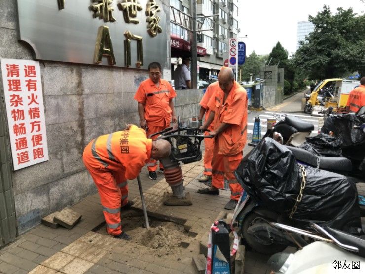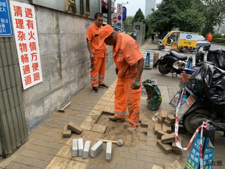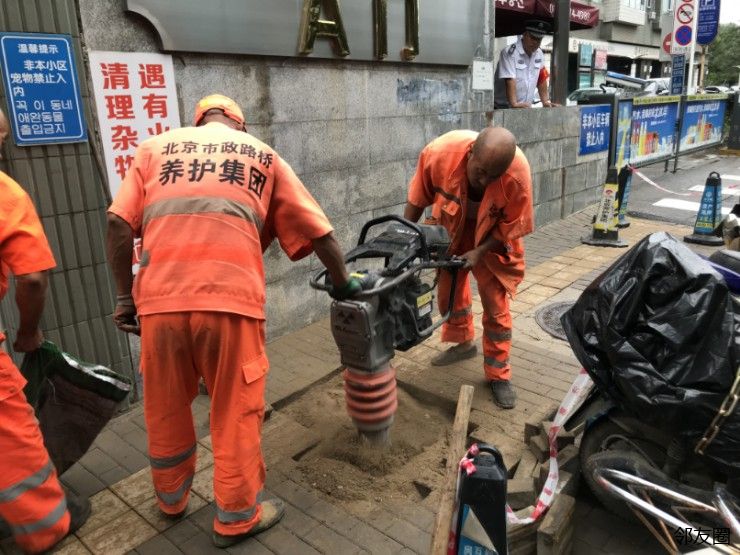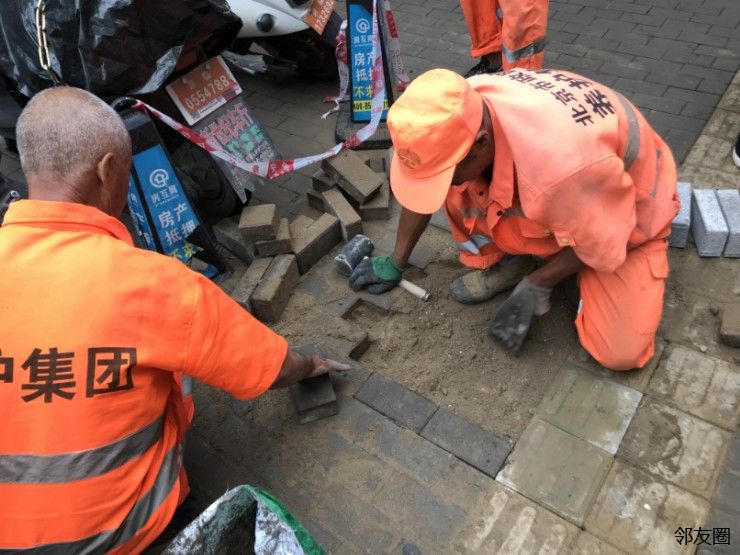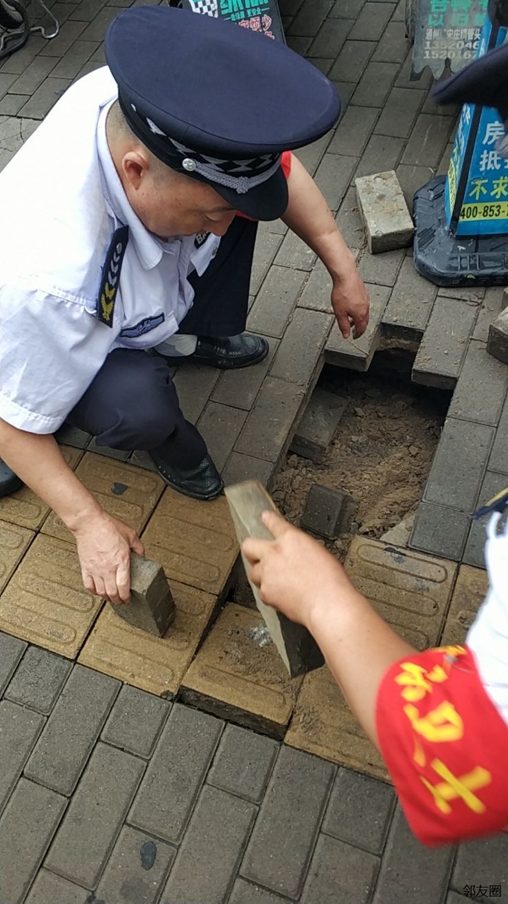 在城建科大力配合下,3时45分左右市政养护队携工具抵达现场,先将沉降处的透水砖打开码放好,再将坑洞处做沙硕土填埋处理,然后使用工具夯实,最后将路面恢复如初。工作有条不紊,用时仅仅40分钟。在此期间,小区保安一直盯守在现场,提醒路人绕道行走,注意安全,避免发生意外。