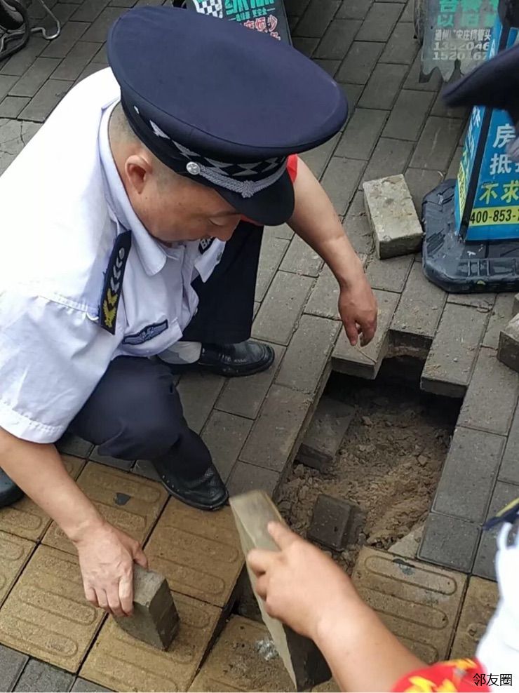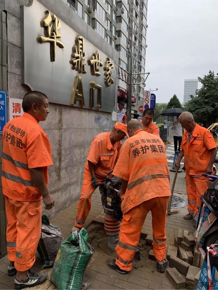 市政养护队携工具抵达现场后,及时制定修理措施,将沉降处的透水砖打开码放好,紧接着将坑洞处做沙土填埋处理,然后使用工具夯实。修理工作有条不紊的进行,40分钟后,沉陷路面恢复如初。