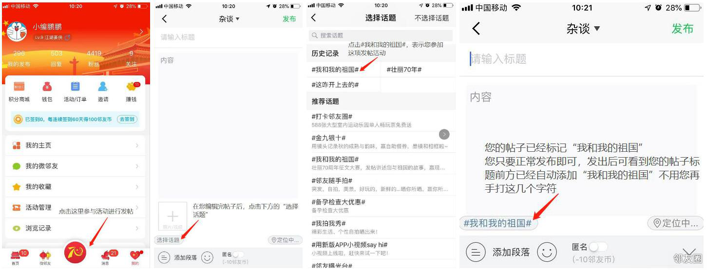 PS:最新发帖攻略1、首先请大家将邻友圈APP更新到最新版本,为5.7.1版本2、参与活动手机发帖流程:(1)、首先请您将邻友圈APP更新到最新版本,目前最新版为5.7.1(2)、发帖流程如下图: