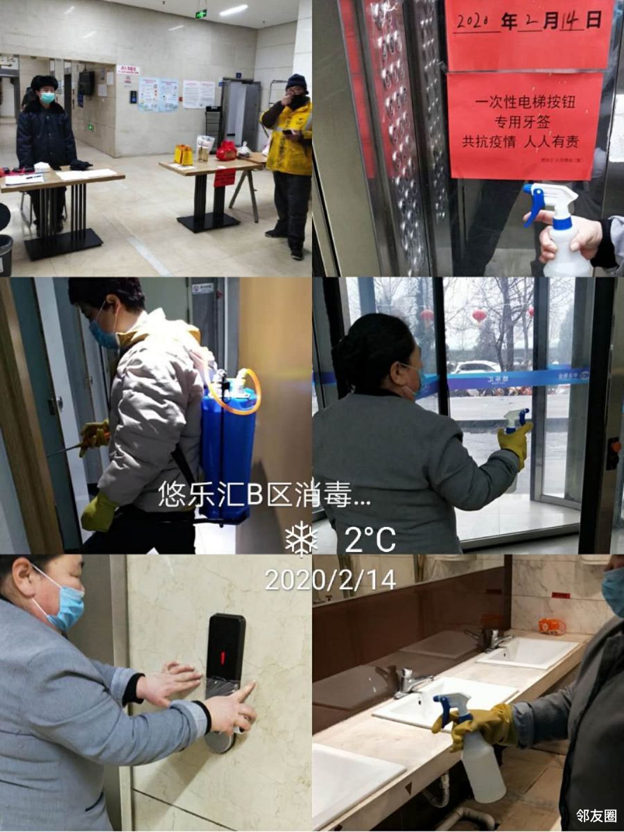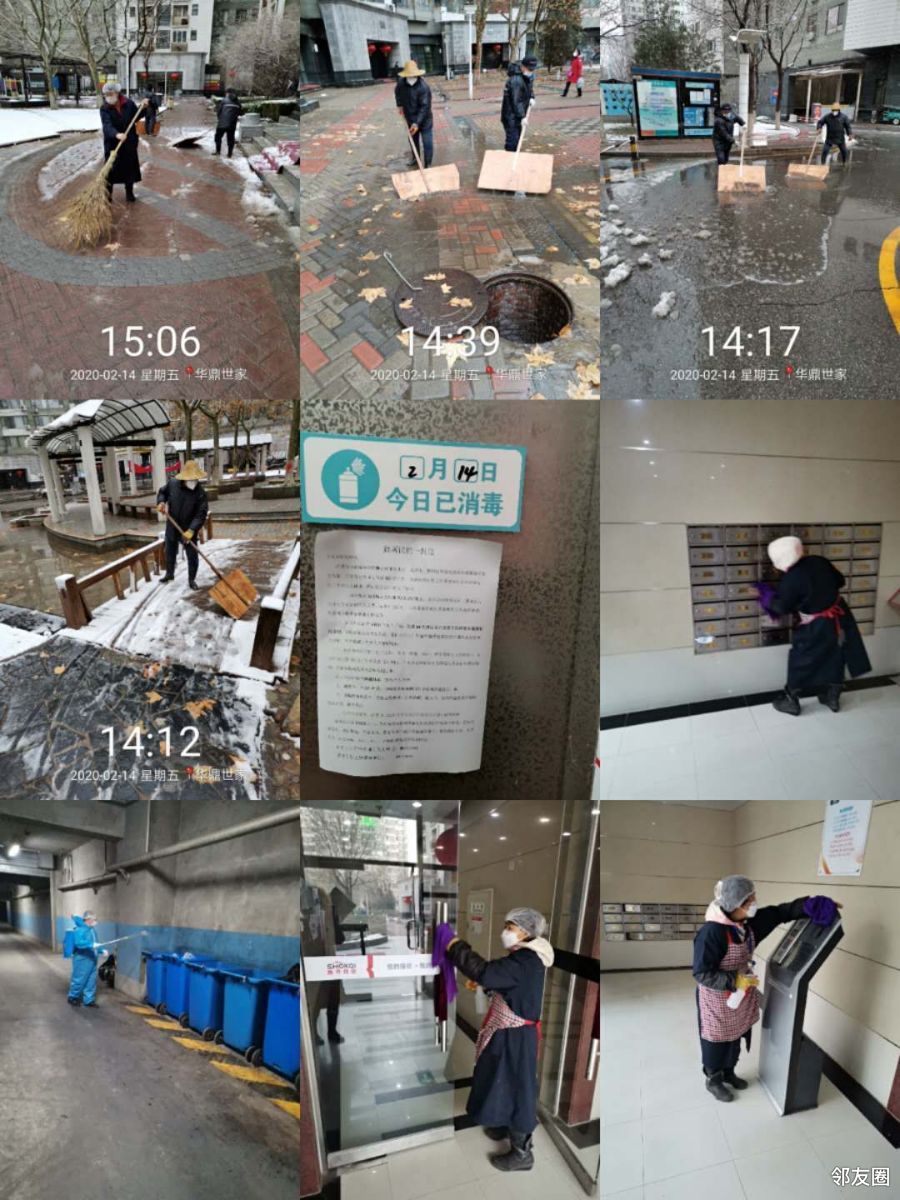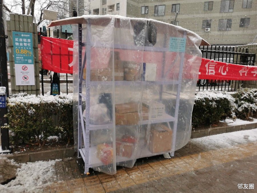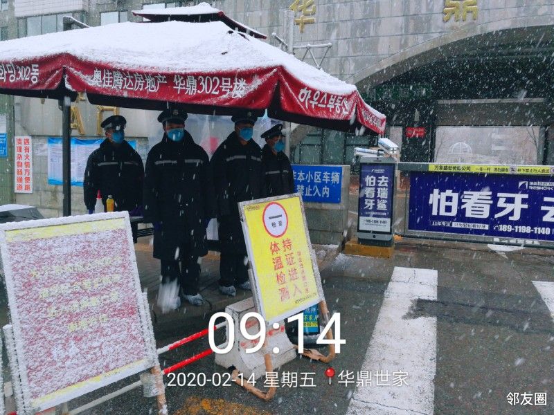 为了把好小区和商业楼宇关卡,物业工作人员日复一日的坚守着岗位,在清晨的风雪中,他们分工值守,有的为了居民出行方便,清扫积雪和积水,在路面上播撒盐粒;有的为园区内垃圾桶、电梯和门把手进行消毒;有的撑起雨棚为进入小区车辆和人员进行测温、登记;有的考虑到居民门的快递会被雨雪淋湿,用塑料布将快递取货架严严实实的进行了遮挡。这每一个小小的举动都让居民们感受到他们对家园的责任心和爱心。