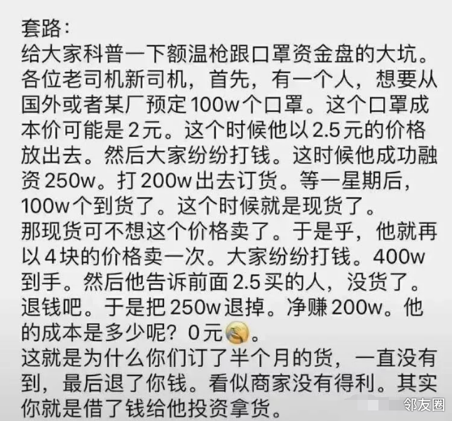 有个网友很有才,把一些口罩倒爷空手套白狼的套跟给总结出来。大家仔细看看,不得不佩服这班口罩倒爷的智商,真是没有做不到,只有想不到。不是因为这次疫情,我还不知道生意还有这样操作的。