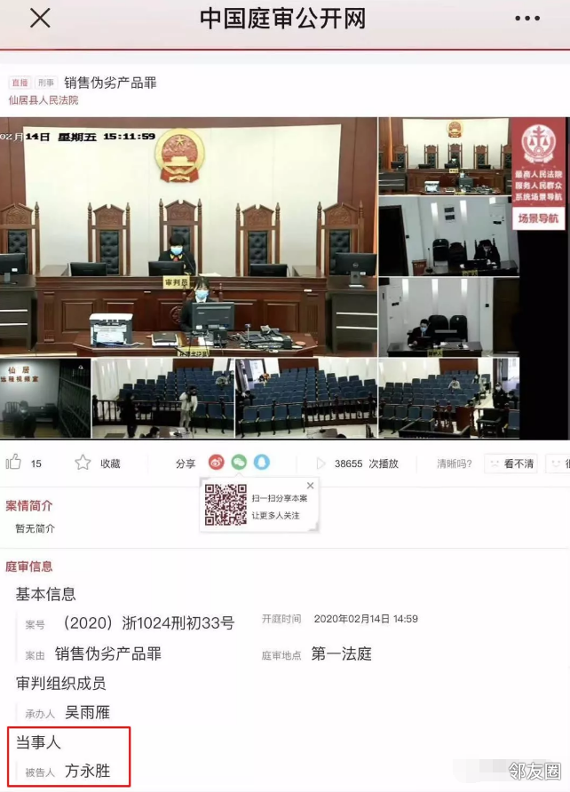 2月6日,方永胜就被仙居县市场监管局的工作人员抓住,扭送到了派出所。2月14日,大家都在过情人节,方永胜在看守所接受互联网法庭远程审判。