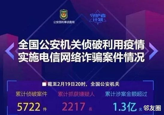 根据公安部发布的信息:截至2020年2月19日20时,全国公安机关累计侦破利用疫情信息进行诈骗案件5722例,累计抓获犯罪嫌疑人2217名,累计涉案金额1.3亿元。