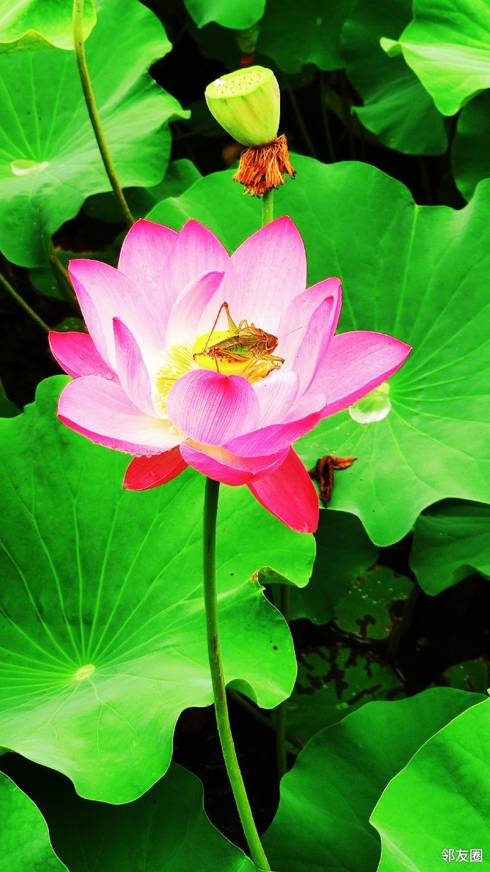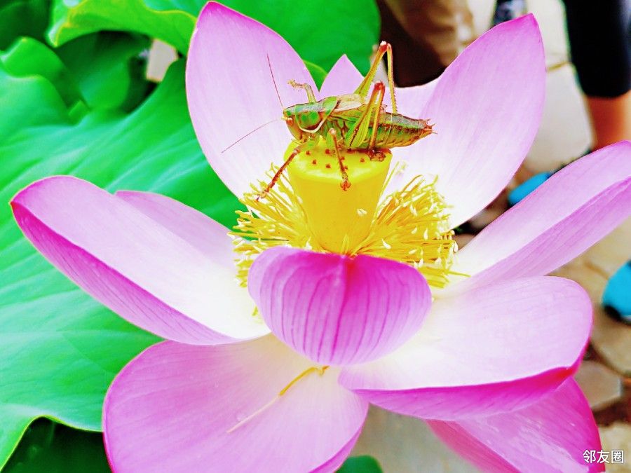 难得看见蝈蝈上荷花,还有个小蛤蟆儿,