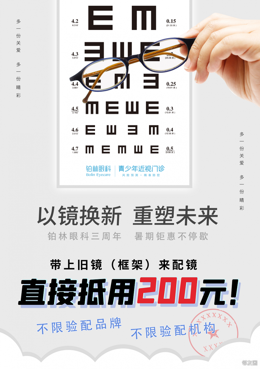 报名成功后,在活动期间,前往铂林眼科配框架眼镜,旧眼镜(框架眼镜) 可直接抵用200元。