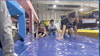 蹦跶蹦跶用力往墙靠,身体腾空挂在魔术贴墙上,借助蹦床的弹力,自己粘到魔术墙上,完成从水平到空中停留的体验!