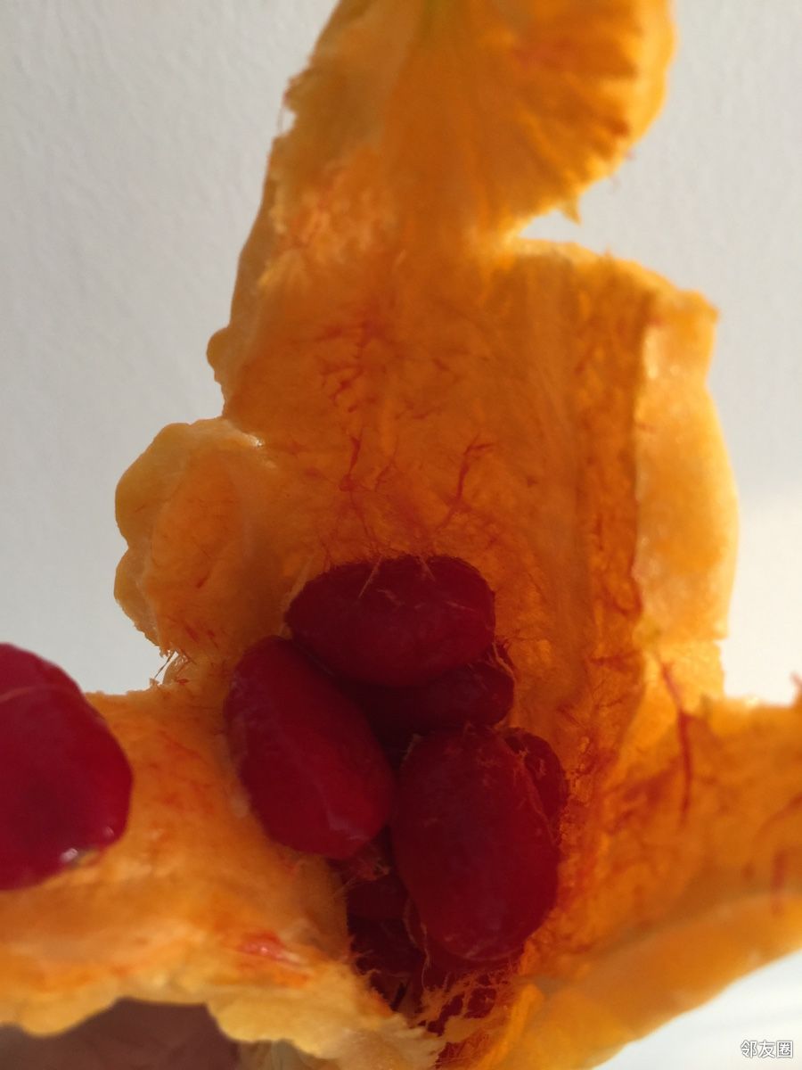 好友给的,刚开始绿绿的,没吃完,放冰箱里,2天居然在冰箱里开花了,这籽红的还真鲜艳!