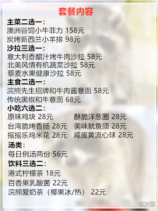 福利:1、餐后可与多只小浣熊互动10分钟~(至多三人);