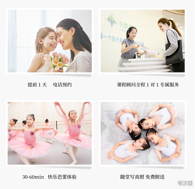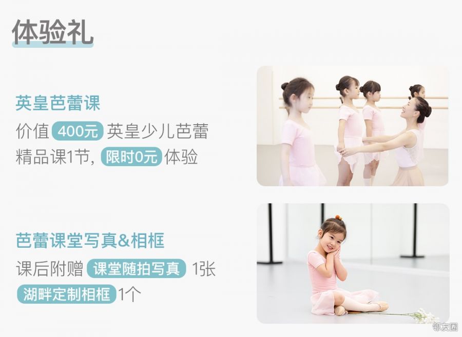 购买拼团成功后,除获得价值400元的英皇少儿芭蕾精品课1节外,到店体验额外赠送芭蕾写真1张,木质相框摆台1个,前30名预约用户到店体验后送神秘礼物一份;