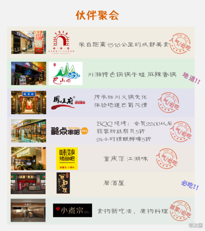 参与商户:聚点串吧;1516串串香;释面;皖老板;鱼你在一起 ;老碗盛;味妙烤鱼吧;巴山雨;酒曜居酒屋;心鲜小煮宗;金汤玉线;凤王府成都火锅(与店内活动不同享);末初美发;京天红;成记鸭血粉丝;鱼鱿天下;猴子救兵;小恒水饺;旦3;快乐柠檬;汤火功夫;悸动烧仙草;许小莓(水果捞不参加活动);好伦哥(套餐参加活动,单品不参加活动);手机体验店;