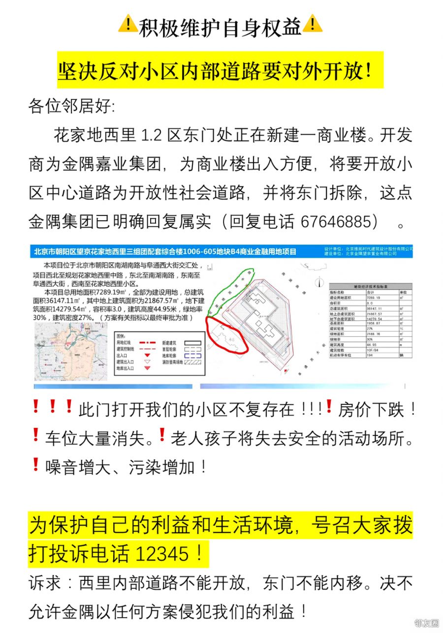 楼主您好,关于您反映的花家地西里小区内部道路开放与东大门内移问题,经社区党委与金隅集团开发协商后,花家地西里小区道路不会对外开放,东大门也不会内移。有问题及时联系居委会。感谢您的关注与反馈!