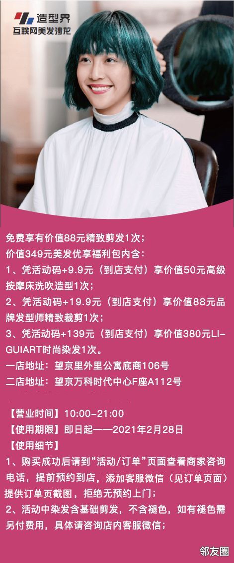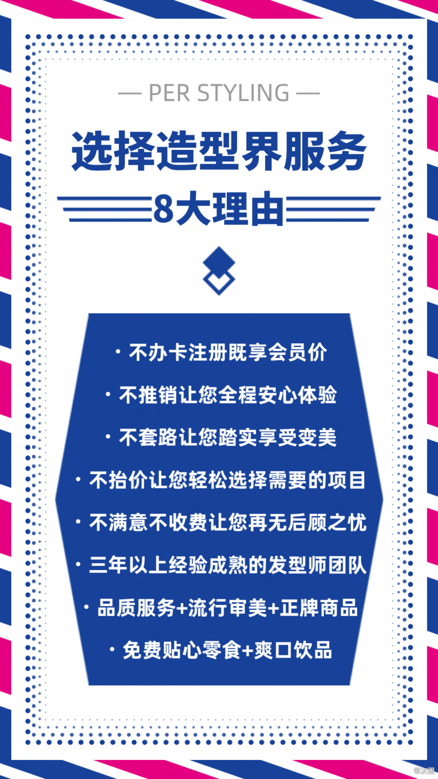 造型界简介本店定位为望京地区互联网美发沙龙,采用注册会员制服,不办卡,注册既享会员价。