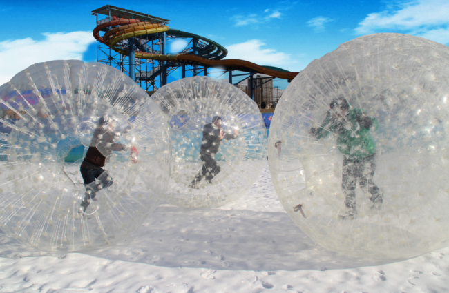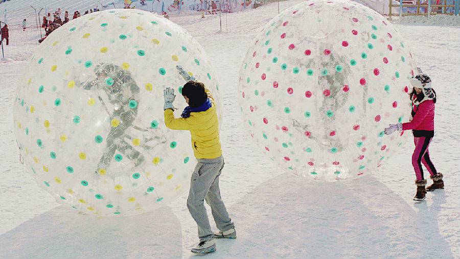 雪地悠波球,体验失重与旋转的双重刺激,当球从斜坡上滚下来的时候,里面的人会随着球体做360度旋转,连续起伏、翻滚是绝对免不了的。特殊的球体结构与材质,为这项惊险的运动平添十分安全。