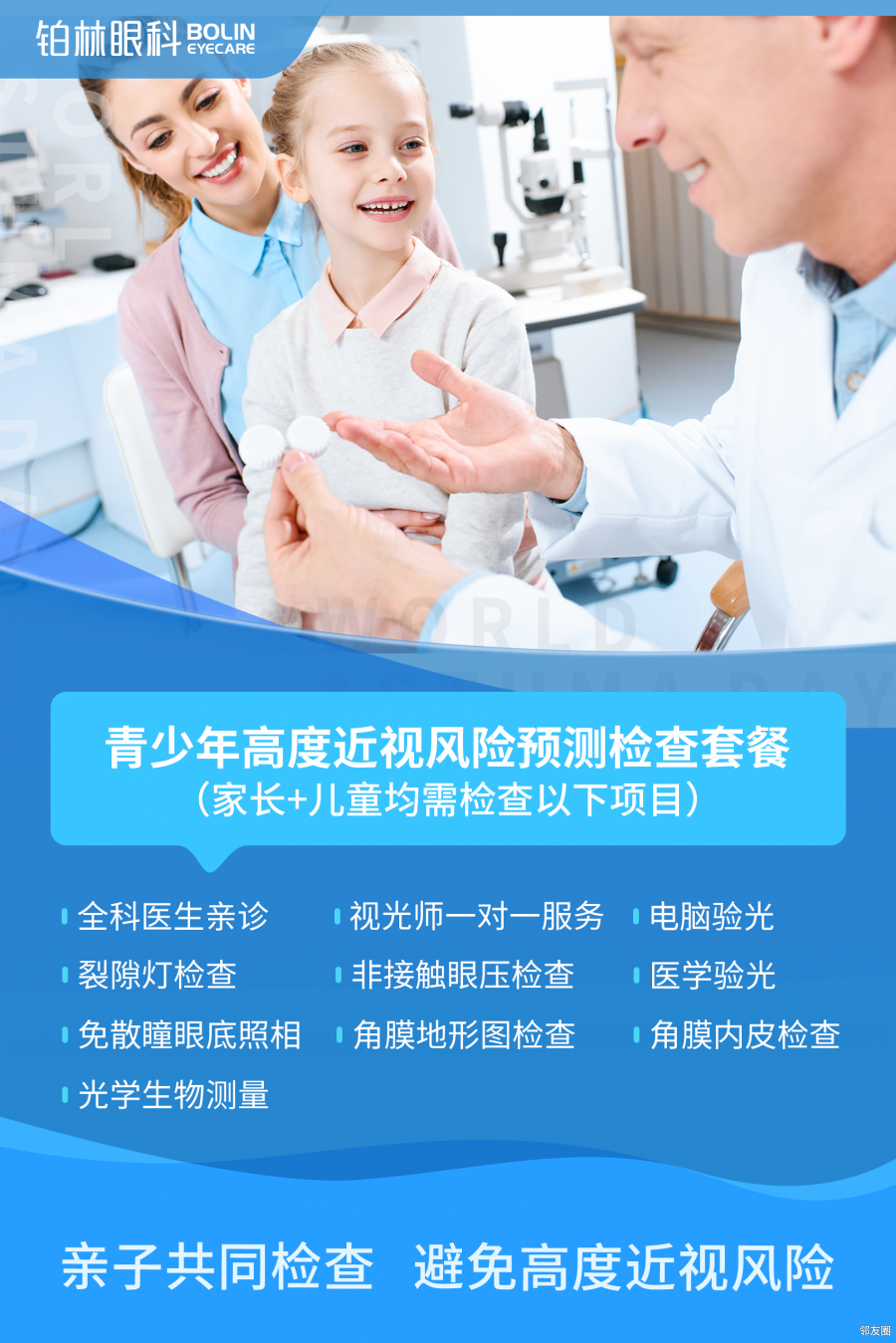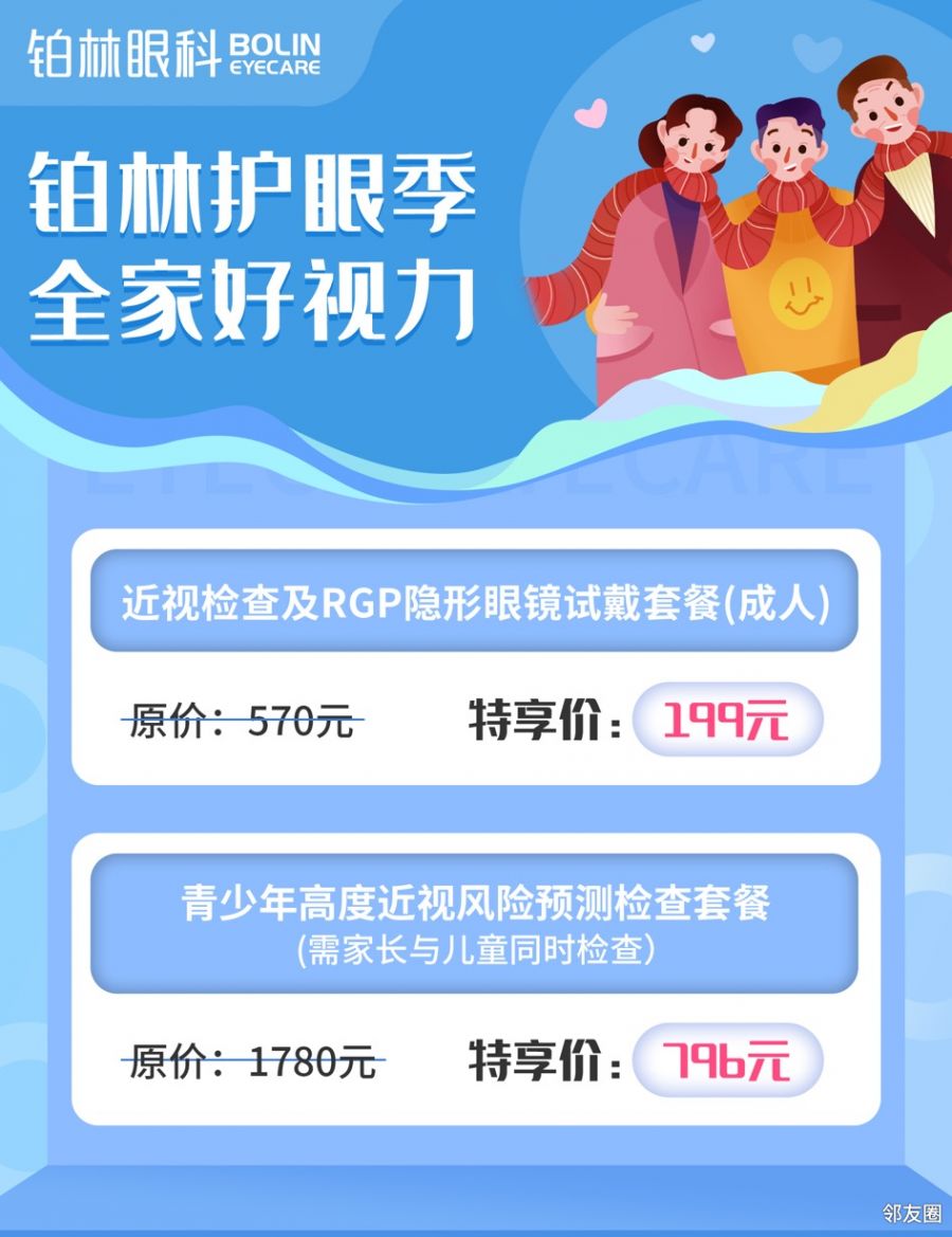活动内容:报名享铂林眼科年末优惠福利,到店仅需付款199元享原价570元的近视检查及RGP隐形眼镜试戴套餐(成人),仅需796元享原价1780元的青少年高度近视风险预测检查套餐(家长+孩子双份检查)