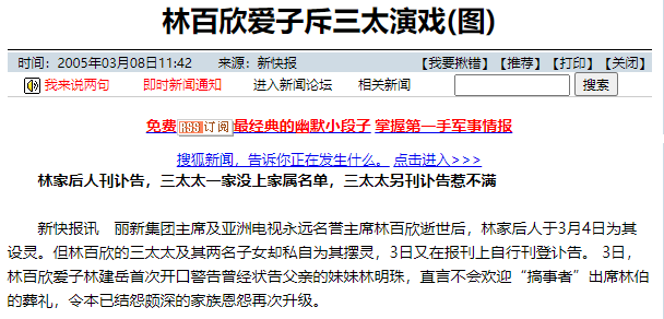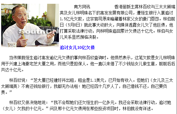 林百欣拒绝帮忙还债,反手将女儿与三太告上法庭,而林明珠随后反告林百欣诽谤,父女彻底闹翻脸,被称为“豪门逆女”。