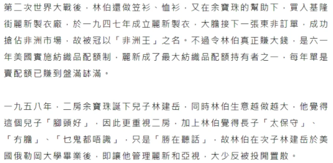 作为长子的林建名一度被给予厚望。55年,留学归来的林建名协助父亲打理集团制衣业务,不过他不太合林百欣的心意。林百欣批评长子“在生意上过于保守”“做事比较慢,头脑简单”,唯一的优点就是“听话”,可惜这不是豪门接班人的基本素养。