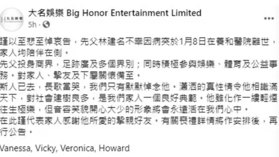 虽然男女关系上颇多诟病,但林建名的亲情缘却是很不错。他离世的消息是由四位子女共同发布,想必病床前的陪伴也给了重病的林建名颇多宽慰。
