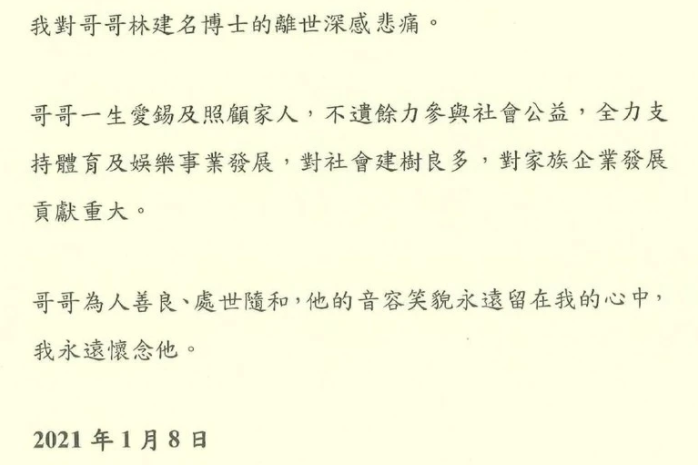 林建名同父异母的弟弟林建岳随后发表悼文,称赞哥哥一生爱惜家人,感叹疫情影响不能见到他最后一面。