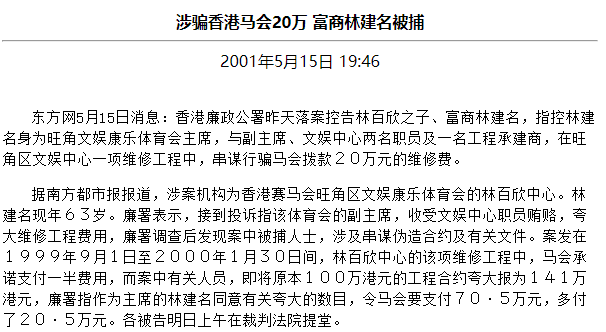 01年林建名又被香港廉政公署落案起诉,指他涉嫌与体育界人士串谋将林百欣中心装修费夸大,以骗取香港赛马会20万元资助。