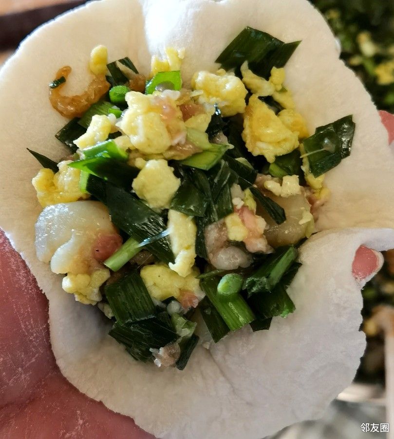 里面的馅儿主要是韭菜,还有鸡蛋、肉馅、贝肌和海米,太香了,巨好吃呀!这大晚上的又馋着您了,真不好意思的。