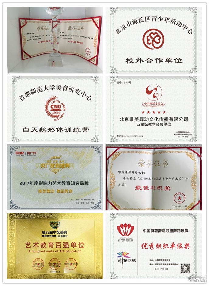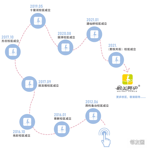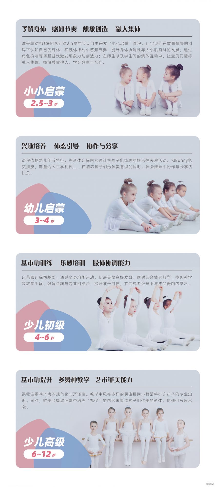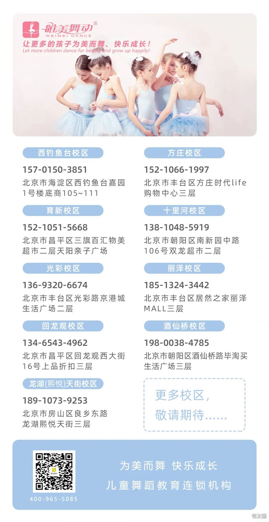 唯美舞动少儿舞蹈隶属于北京唯美舞动文化传播有限公司,是一家专注于儿童形体舞蹈教育的连锁机构,创立于2012年,目前在北京有9家直营校区,在册学员约3000名。唯美舞动少儿舞蹈是中国舞蹈家协会会员单位、首都师范大学美育中心合作单位、北京市海淀区青少年活动中心校外合作单位,依托优质的教学环境、优秀的教研团队、科学的教学体系、全职的教师团队,为广大儿童带来优质的舞蹈教学与服务。『教师团队』『课程内容』『考级风采』唯美舞动少儿舞蹈每年组织学员们参加考级,记录成长瞬间,并收获快乐自信『演出集锦』唯美舞动每年举办两次大型专场展演,所有学员均可自愿报名参加,并和中央电视台、北京电视台等单位建立良好的合作关系,为学员提供了丰富的展示平台。『校区环境』『家长评语』『发展历程』『机构荣誉』『校区地址』:『咨询方式』:如果您在报名中遇到任何问题,请随时与邻友圈客服小编联系(微信号:bjjiuemi)在各大应用市场或苹果AppStore搜索“邻友圈”,或点击下方链接,即可下载邻友圈APP下载地址:https://app.linyouquan.net/