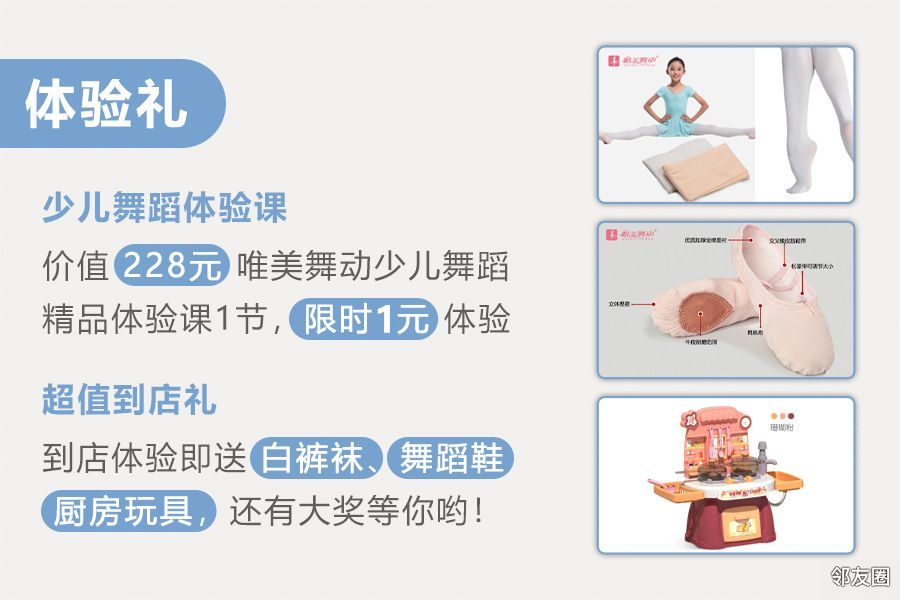 您是否想让自己的孩子拥有一个优美的体型、出众的气质?或是又想给枯燥的文化课程添加点调味剂?快来带孩子学舞蹈吧~唯美舞动少儿舞蹈开学季钜惠来袭!仅需1元享价值228元舞蹈精品体验课+芭蕾舞裤袜+舞蹈鞋+精美玩具!全北京9家直营校区~-拼团详情-