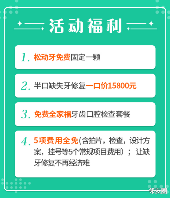 松动牙免费固定一颗;2.半口缺失牙修复一口价15800元;