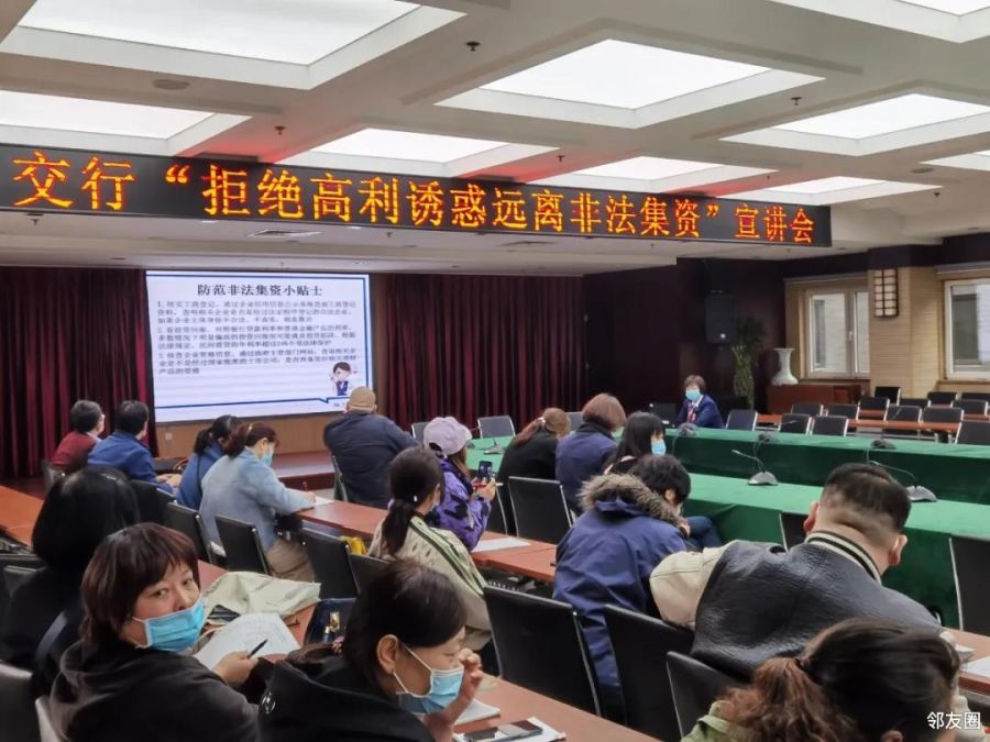 3月30日下午,望京街道平安建设办公室组织开展“拒绝高利诱惑远离非法集资”宣讲会。邀请了交通银行北京望京中环路支行讲师讲解非法集资相关常识,望京地区居民代表共25人参加。