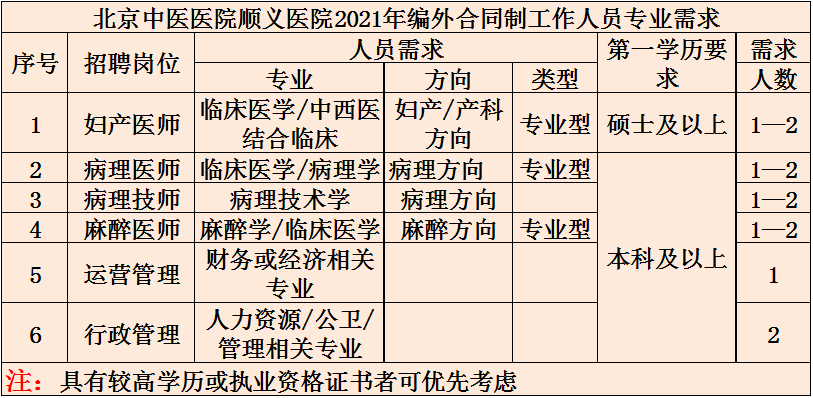 本次为2021年编外合同制工作人员公开招聘,共涉及6个招聘岗位,具体岗位见公告结尾附件:北京中医医院顺义医院2021年编外合同制工作人员专业需求。