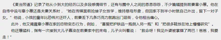 他还说,章小蕙甚至当着孩子的面打自己的妈妈,把孩子吓得惊慌失措。