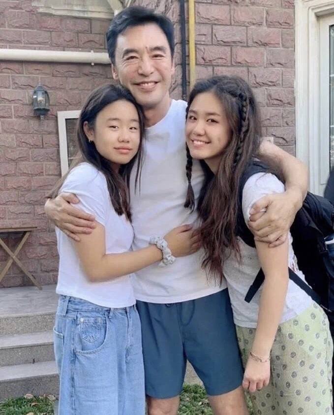 照片中,钟镇涛和两个女儿紧紧相拥,画面看起来非常温馨。