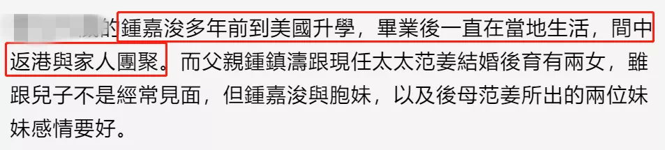 不过,他和父亲钟镇涛、继母范姜关系依旧很好,经常返港与他们团聚。