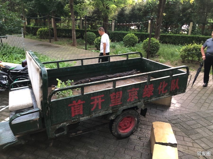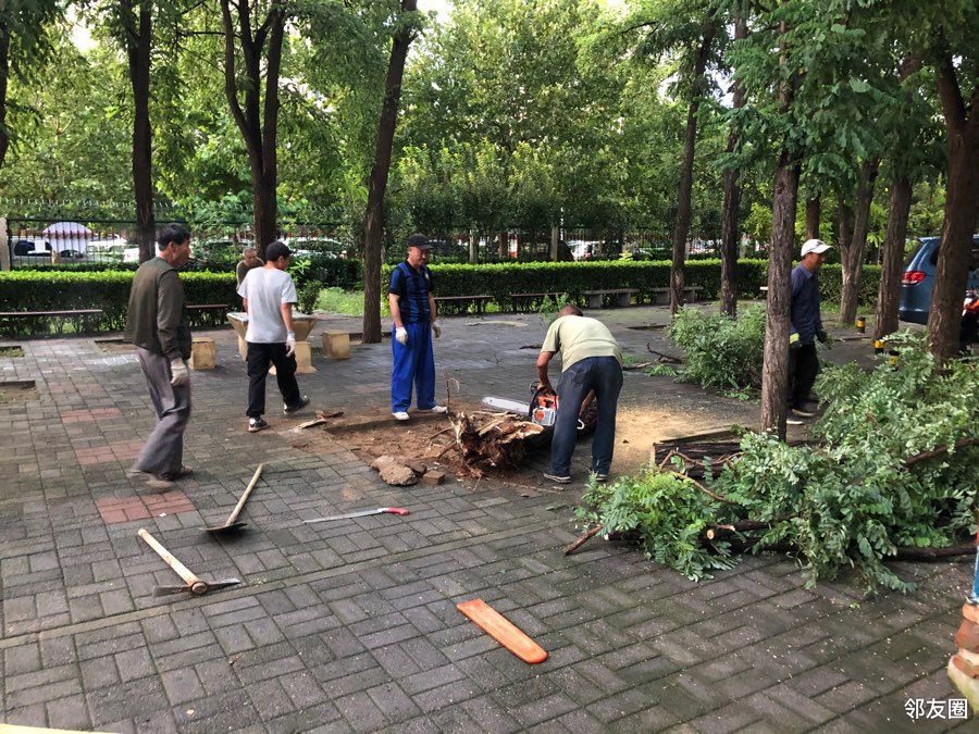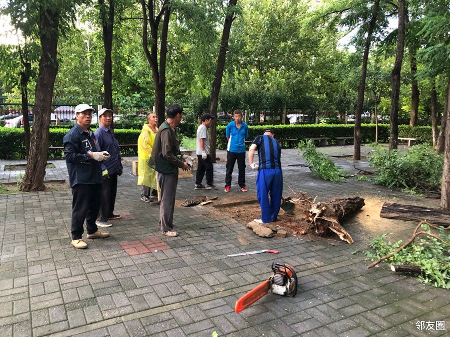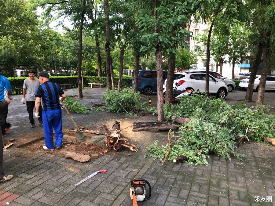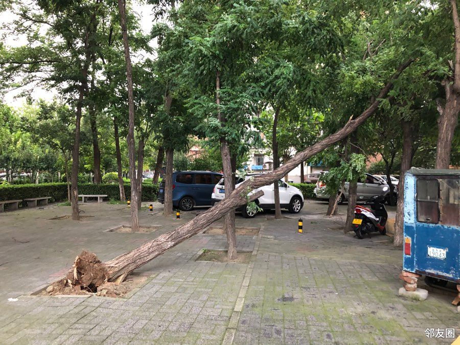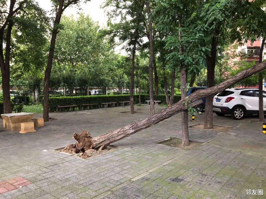 今日下班时分一阵乌云伴随狂风暴雨,我到家陋习一看,一棵槐树被狂风折断,歪在居民休闲处。