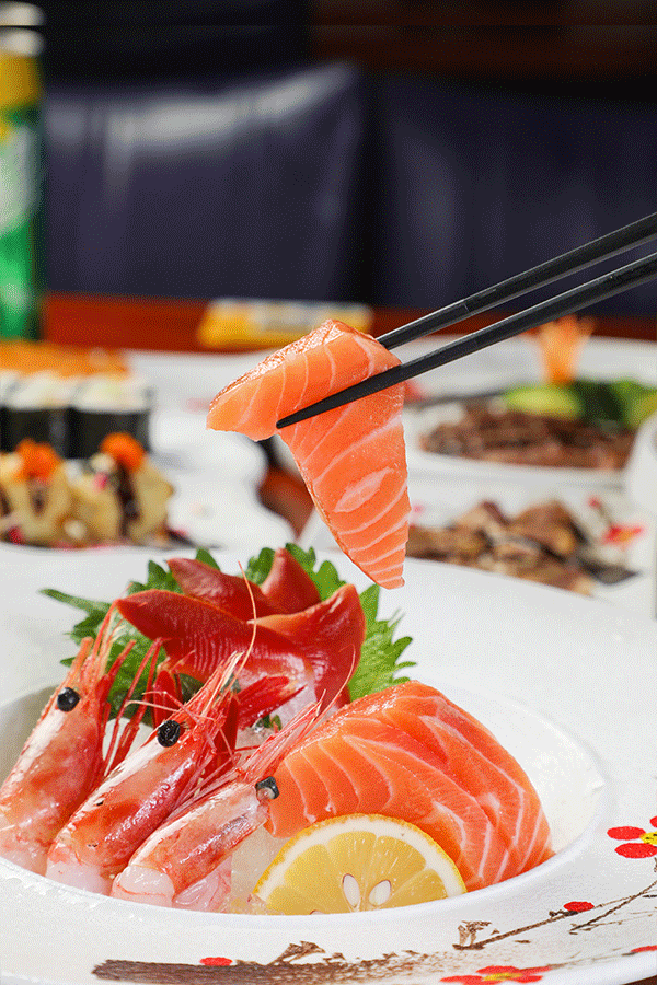 每人一份的刺身拼盘包括了蓝旗金枪鱼刺身、甜虾刺身、北极贝刺身