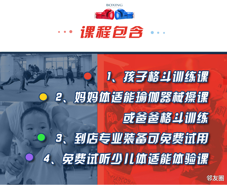 1节妈妈体适能瑜伽器械操课 ·1节孩子格斗类训练课请提前2-3天跟客服老师预约。