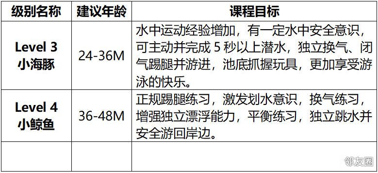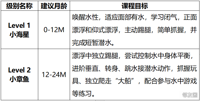 非你可思亲子游泳课程面向0-4岁婴幼儿家庭,采用小班制教学,根据不同阶段儿童生长发育及心理特征,将亲子游泳分为4个级别,每个级别都有相应的课程目标。课程涵盖了丰富多元的亲子水育、早教以及游泳内容,在充分尊重儿童发展规律的前提下,设计五大核心模块:Warm up (律动热身) 、Ready go(闭气练习)、I can do(潜水训练)、Play fun(互动游戏)、Jump high(跳水训练)。同时,根据宝宝参与时间及程度定期更新活动内容、调整活动形式。