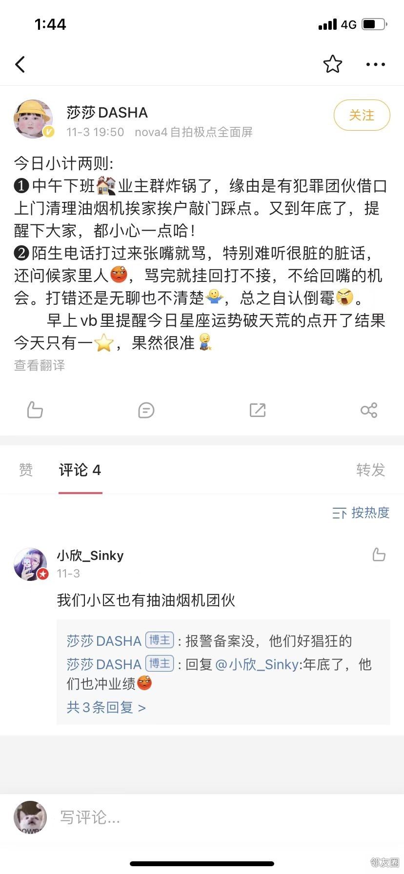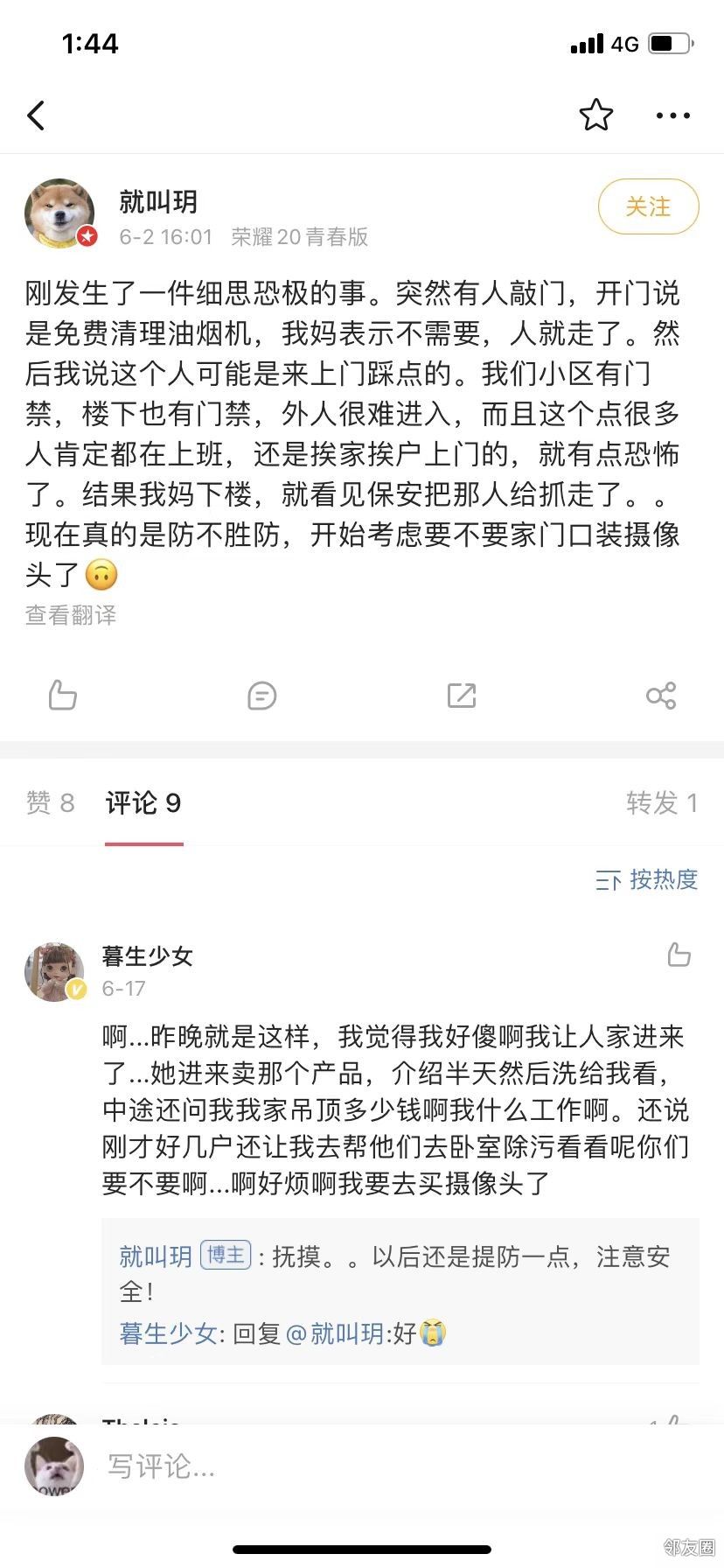 这周确实有抽油烟机清洗的人敲过门,家里两个大人。