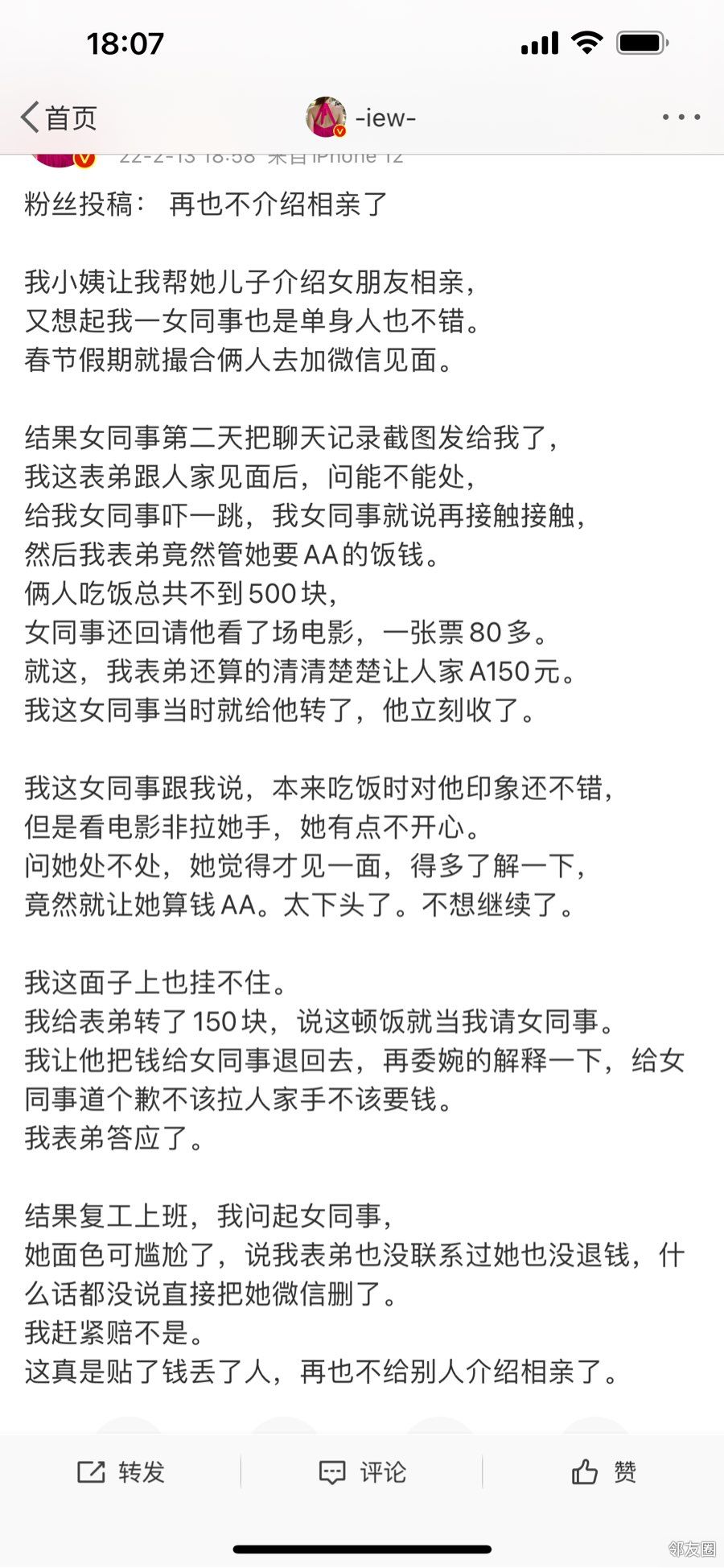 哈哈哈😁微博看到一个帖子,分享给大家,不过相亲男女的费用确实也是现实问题,大家来畅所欲言呀