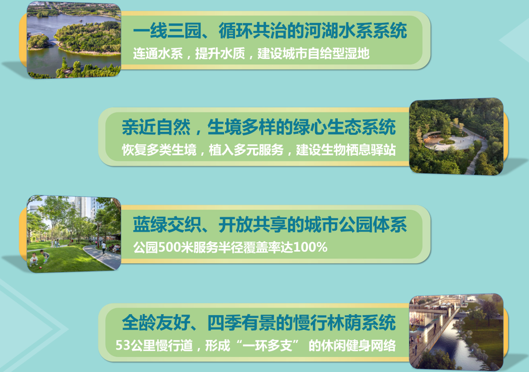 综合服务与居住片区:以连通小龙河生态廊道和绿心生态空间的开敞空间网络为链条,形成多个环境优美的居住生活片区