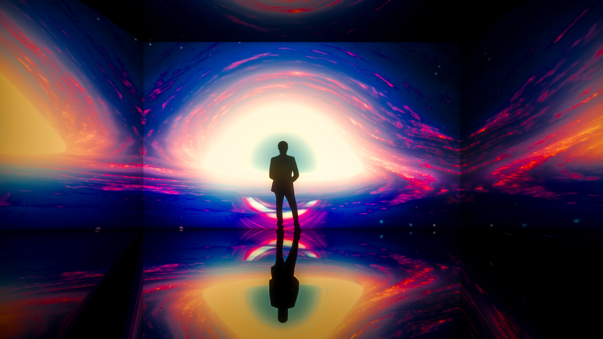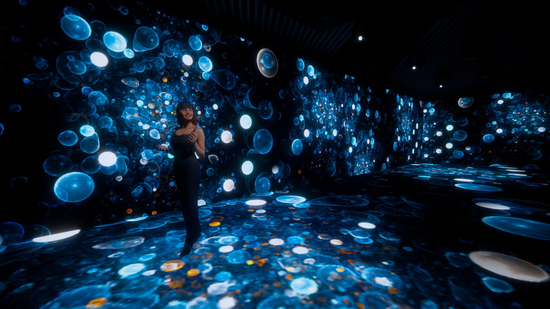 带着同样的憧憬与畅想,数十位艺术家、近百位程序猿,为我们描绘了一个沉浸、科技、艺术、交互的空间,在这里,有裸眼3D动画叠加的多维艺术;在这里,有数字人爱达与你连线,诉说玄界时空的神秘存在。