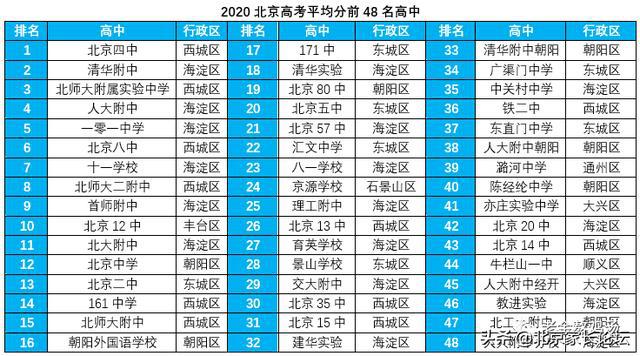 从表中我们可以看出, 老牌朝阳名校陈经纶和八十一个12个,一个3个,而朝外和北中一个12个,一个8个。 最主要的是北京中学在2020届只有80多个考生。 10%的清北率,这个是怎么做到的?朝外的情况稍微好理解一些,朝外不参加中考全部都是内循环,自我培养, 根正苗红。北中是什么情况?而后来网传的一则2020年高考平均分北京前48名的消息则彻底让大家再一次受到冲击: